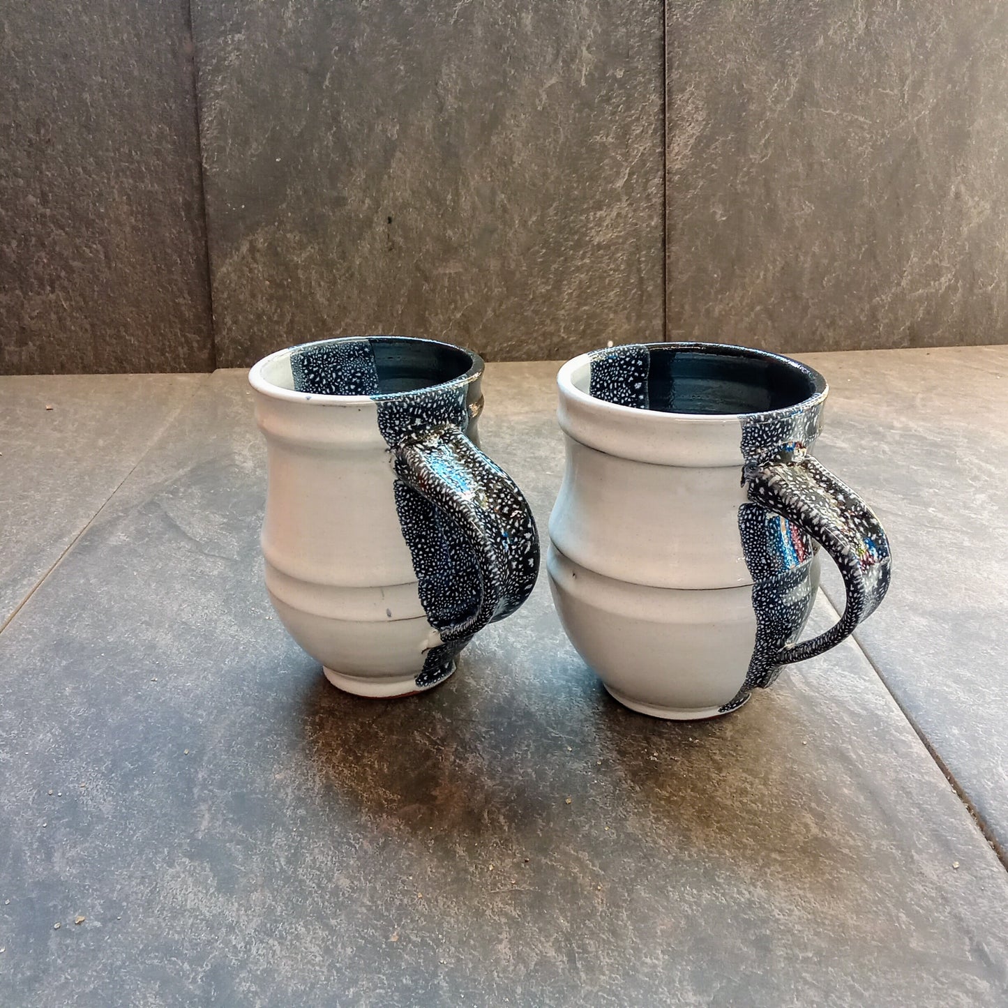 This design by Nicky is made to be comfortable. It's bowled bottom and slightly narrowing neck keep the weight well balanced when full, and reduces cooling of hot drinks. A comfort groove around the belly helps it snuggle into your hand, whilst the grooved rim settles warmly on the lip. They stand approximately 10cm tall and 8cm wide with a 300ml capacity.